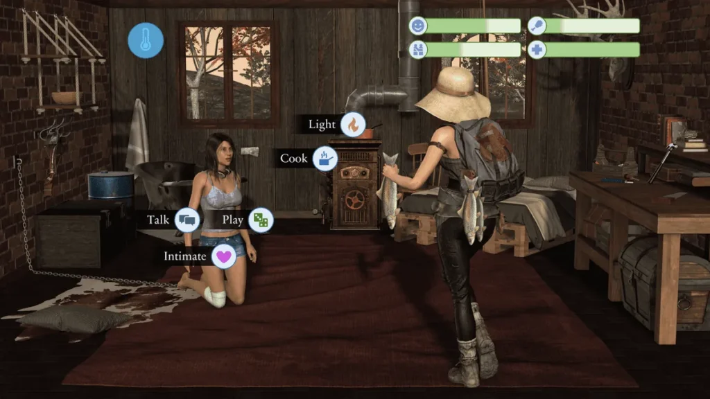 The Teen Zombie in Your Cabin story grows through your interactions. You can teach her simple tasks, play records on an old phonograph, or just sit together in silence. Every action feeds into a nuanced relationship system. Her mood isn’t just a meter; it’s shown through subtle animations and dialogue fragments. Feed her only scavenged meat, and she might grow more agitated and feral. Spend time on calming activities like drawing or listening to gentle music, and you might be rewarded with a soft, mumbled word—a shard of her former self.